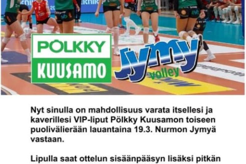 VIP-liput puolivälierään 19.3.2022 Julkaistu 15.3.2022 Nyt sinulla on mahdollisuus varata itsellesi ja kaverillesi VIP -liput Pölkky Kuusamon toiseen puolivälierään. Jatka lukemista